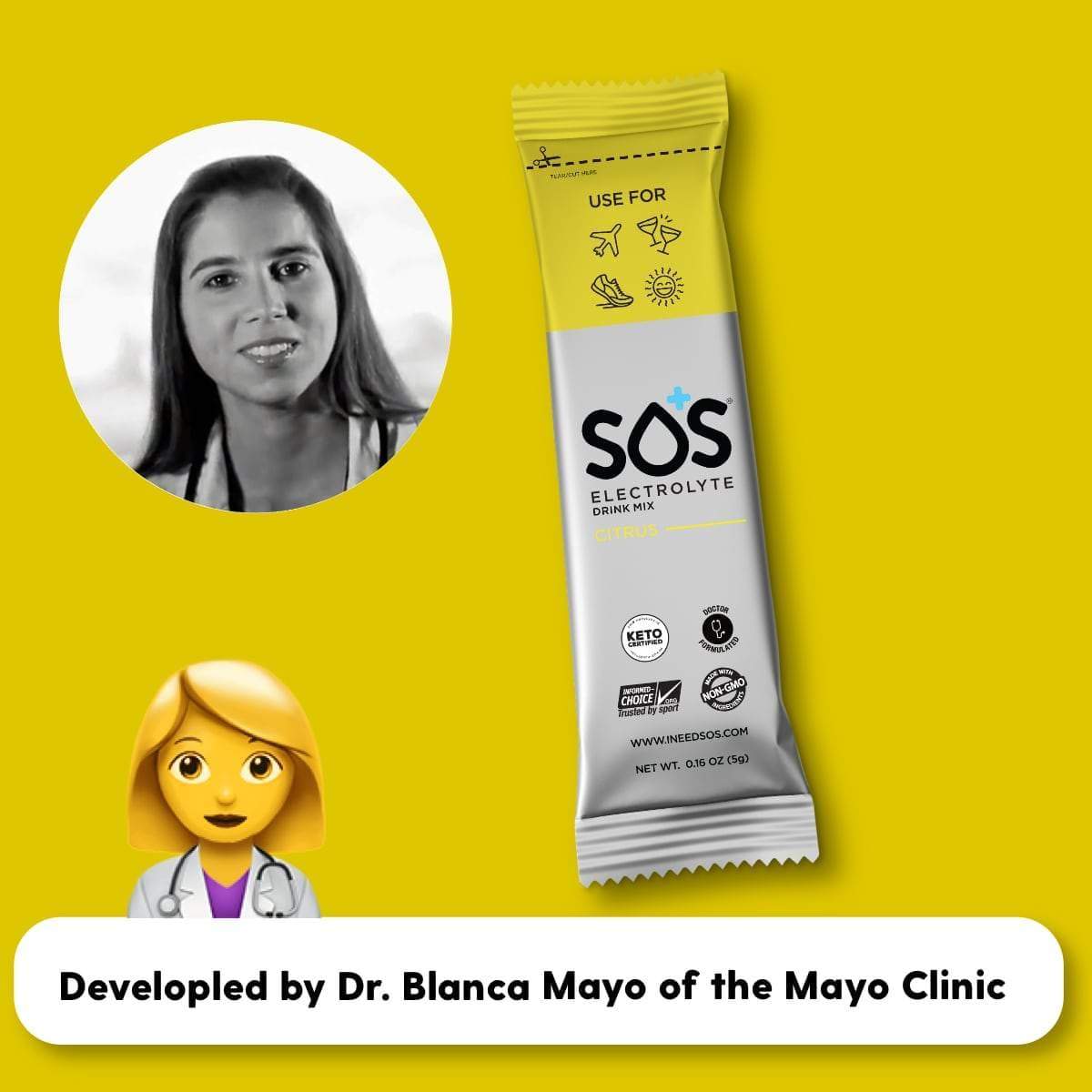 Dr. Blanca Mayo of the Mayo Clinic developed SOS Hydration using the best science in medicine and sports science to help her patients, athletes, and anyone suffering from illness. SOS is an Oral Rehydration Drink that is packed with electrolytes, only 2g of sugar (the sugar is used to more rapidly rehydrate you). SOS is as effective as a drip IV at combating mild to moderate dehydration.