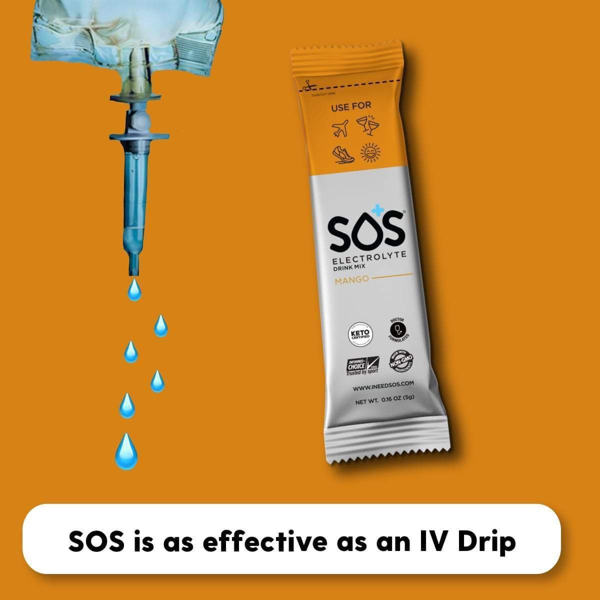 - Healthier sports drink: SOS contains 75% less sugar than other sports drinks on the market. It's made using premium, non-GMO ingredients and contains no fillers, artificial ingredients, or preservatives. It's also Keto Certified by the Paleo Foundation.